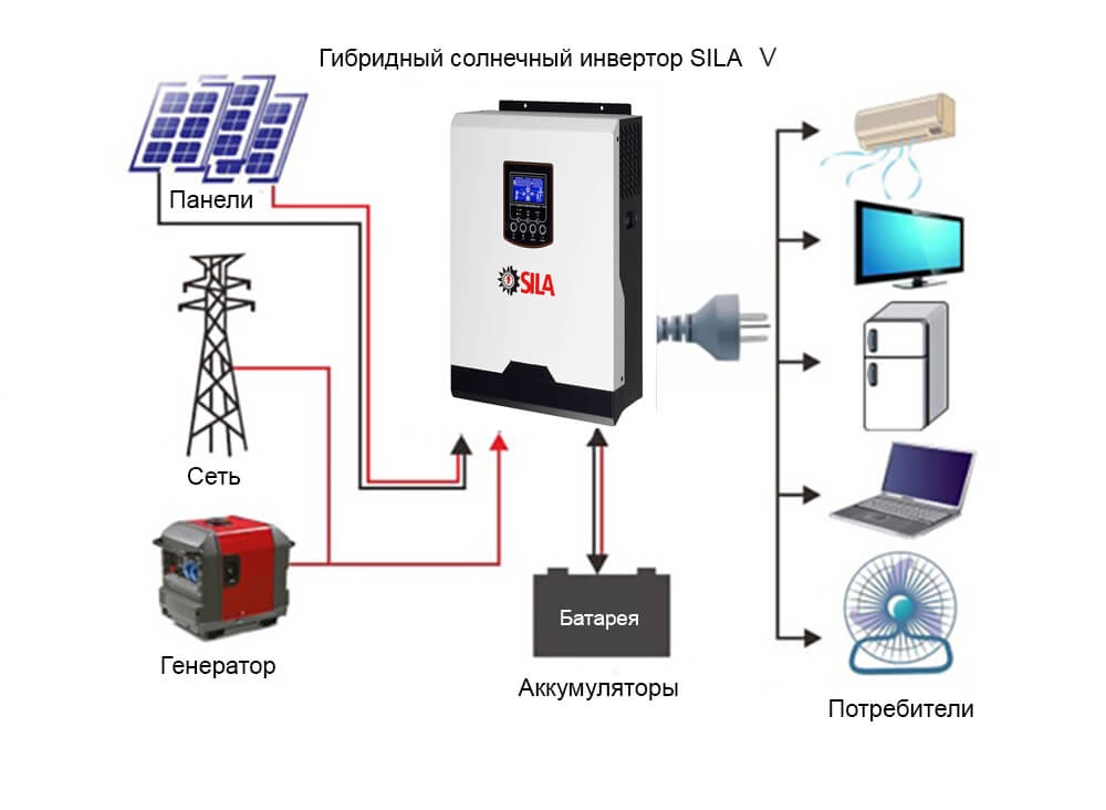 Гибридный солнечный инвертор SILA V 3000M (PF 1.0) для дома и дачи это обновленная версия инвертора SILA V 3000M с коэффициентом преобразования 1.0 и мощностью 3 кВт. SILA V 3000M (PF 1.0) - многофункциональный инвертор/зарядное устройство мощностью 3 кВт, в котором сочетаются функции инвертора, контроллера заряда аккумуляторов от солнечных батарей и зарядного устройства аккумуляторных батарей от сети 220 В для обеспечения бесперебойной подачи питания, с возможностью выбора приоритетов зарядки и нагрузки. Используется в небольших солнечных электростанциях и системах бесперебойного питания.